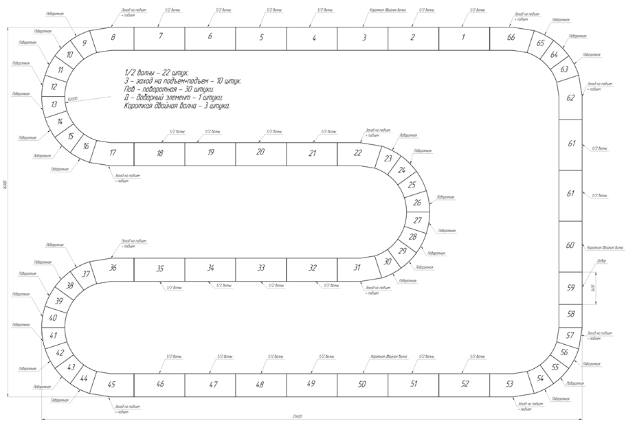 12 | Памп-трек размер (22680х13460х1000) | Боковые стенки выполнены из стального листа S3, рёбра жесткости и каркас выполнены из профильной трубы 40х40х4, 40х20х2, полосы 30х5. Покрытие рабочей поверхности: фанера S12, фанера S6 в 2 слоя. | 1/2 волны - 10 шт. Заход на подъем + подъем - 10 шт.